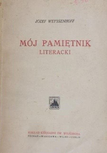 Mój pamiętnik literacki / Józef Weyssenhoff. - Poznań : nakładem Księgarni św. Wojciecha, [1925] (Poznań : Drukarnia św. Wojciecha). - [2], 194, [1] strona, [1] karta tablic : portret ; 18 cm.
