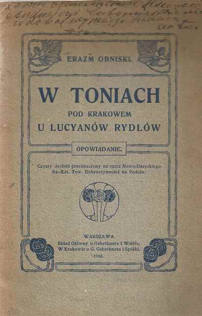 W Toniach pod Krakowem u Lucyanów Rydlów : opowiadanie / Erazm Obniski. - Warszawa : Skład Główny u Gebethnera i Wolffa ; Kraków : G. Gebethner i Spółka, 1913 (Warszawa : Drukarnia "Czasu"). - 63, [1] strona ; 23 cm.
