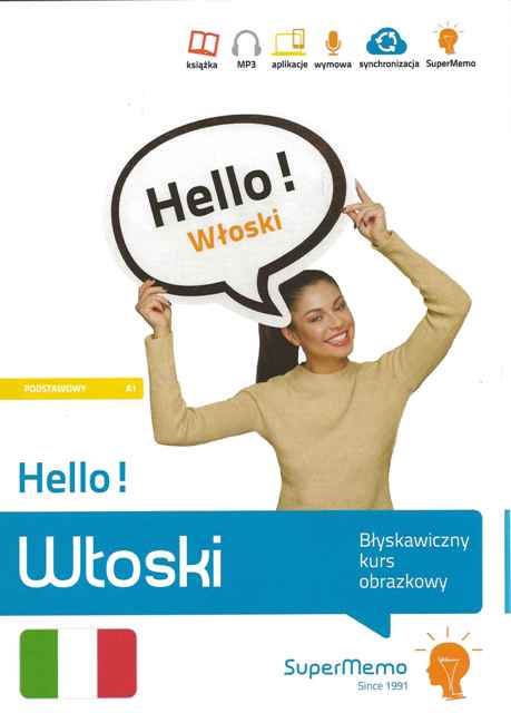 Opanuj błyskawicznie ponad 500 włoskich słów i zdań, zebranych w 5 działach tematycznych, aby porozumiewać się swobodnie w 51 podstawowych sytuacjach komunikacyjnych na poziomie A1. "Hello! Włoski" to zawierająca 120 stron książka z obrazkowym kursem języka włoskiego do samodzielnej nauki słownictwa i wyrażeń przydatnych podczas podróży lub kontaktu z obcokrajowcami. Publikacja obejmuje również nagrania MP3 oraz ćwiczenia wspierane oryginalną metodą inteligentnych powtórek w serwisie i aplikacjach Super Memo. [SuperMemo World, 2020]