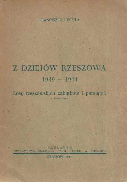 I. Wrzesień 1939 roku ; II. Okupacja 9. IX. 1939 - 1. VIII. 1944: Bernardyńskie figury, Orły, Pomniki, Tablice pamiątkowe, Dzwony, Budynki zabytkowe, Rozmaitości ; III. Bitwa o Rzeszów 30. VII. - 2. VIII. 1944.