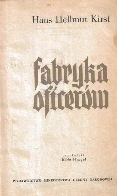 „Fabryka oficerów” jest książką w pełni oddającą największe okropności nazizmu i wojny. Ma formę dziennika prowadzonego przez kadeta z pewnej akademii wojskowej (prawdopodobnie tej, w której Kirst w latach 1943-1945 wykładał). Miejscem akcji jest więc szkoła wychowująca i kształcąca w trybie przyspieszonym oficerów do służby na froncie. Takie „maszynki” kierujące śmiercionośnym ogniem strzelców. Opisana historia podobno wydarzyła się naprawdę podczas 16. kursu dla oficerów, który trwał od 10 stycznia do 31 marca 1944 r. w Szkole Wojennej w Wildingen nad Menem. Jak zwykle Kirst do opisu dołączył wyciągi z akt sądu wojennego, listy, życiorysy. Powieść stwarza więc nieodparte wrażenie autentyczności i potwierdza prawdziwość zdarzeń, choć nazwiska zostały z pewnością zmienione. Wszystko miało służyć „straconemu pokoleniu” (za które i Kirst się uważa!) ku pamięci, a młodzieży ku przestrodze, aby nigdy więcej się to nie powtórzyło! W sumie – książka jest jednym wielkim oskarżeniem i napiętnowaniem nazizmu, III Rzeszy i wojny. Oskarżeniem systemu, któremu autor również (jak wielu innych Niemców) w młodości gorliwie służył. Powieść ukazuje bardzo gorzką prawdę o słabości ludzkiej. [lubimyczytac.pl, 2022]