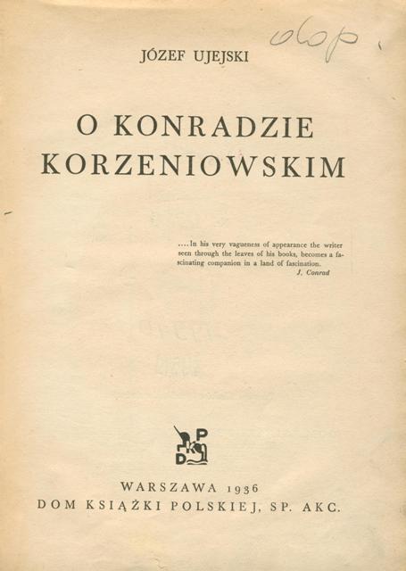 O Konradzie Korzeniowskim / Józef Ujejski. - Warszawa : Dom Książki Polskiej, 1936 (Warszawa : M. Arct). - 298, [6] stron : fotografia ; 23 cm.
