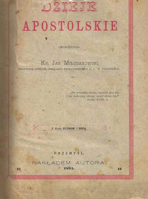 Dzieje Apostolskie / opowiedział Jan Milczanowski. - Przemyśl : nakładem autora, 1894 (Przemyśl : J. Styfi). - 300, [3] strony, [6] kart tabl. : ilustracje, mapa ; 23 cm.