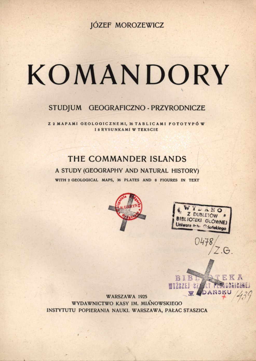 Komandory : studjum geograficzno-przyrodnicze = The Commander Islands : a study (geography and natural history) / Józef Morozewicz. - Warszawa : Wydawnictwo Kasy im. Mianowskiego Instytutu Popierania Nauki, 1925 (Kraków : Druk W. L. Anczyca i Spółki). - XIV, 230 s., [2] k. tabl. złoż., XXXVI k. tabl. : fot., mapy, (w tym kolor.) ; 24 cm.