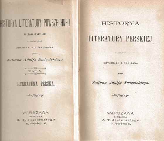 Historya literatury perskiej Cz. [1]-2 / Julian Adolf Święcicki, - Warszawa : [wydawca nieznany,, 1902] (Warszawa : Drukarnia A. T. Jezierskiego). - 2 tomy w 1 woluminie (289, [1] ; 237, [2] strony) : ilustracje ; 18 cm.