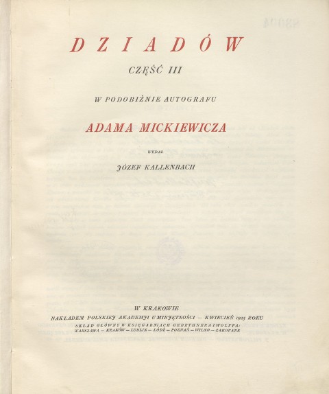 Dziadów część III w podobiźnie autografu Adama Mickiewicza / wydał Józef Kallenbach. - Kraków : nakładem Polskiej Akademji Umiejętności ; Warszawa i inne : skład główny w Księgarniach Gebethnera i Wolffa, 1925 (Kraków : Druk. Uniwersytetu Jagiellońskiego). - VII, [1], 126 strony ; 26 cm.