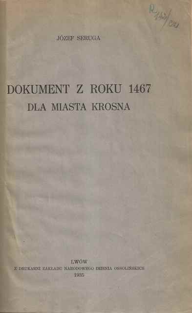 Dokument z roku 1467 dla miasta Krosna / Józef Seruga. - Lwów : [wydawca nieznany], 1935 (z Drukarni Zakładu Narodowego imienia Ossolińskich). - 7 stron ; 25 cm.