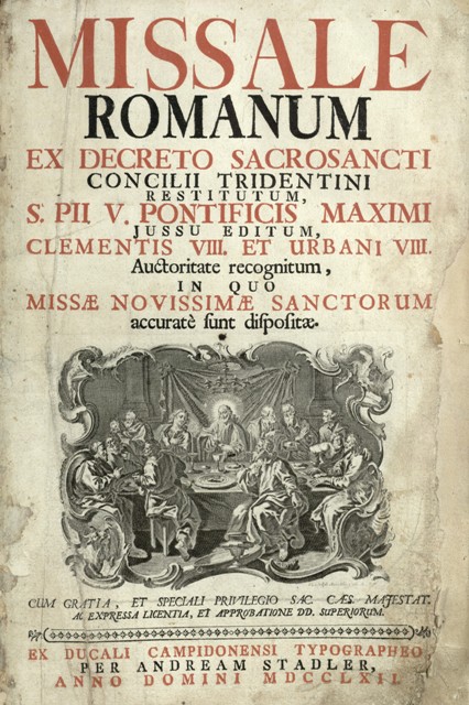 Missale romanum : ex decreto Sacrosancti Concilii Tridentini restitutum S. PII V pontificis maximi jussu editum Clementis VIII. et Urbani VIII. Auctoritate recognitum in quo missae novissimae sanctorum accurate sunt dispositae. - [Campidonae] : Ex ducali Campidonensi Typographeo per Andream Stadler, 1762. - Wol. ([2], 1-306, [2], 307-348, [4], 349-378, [2], 379-384, [2], 385-386, [1]-2, 387-388, [1]-2, 389-390,[1]-2, 391-392, [2], 393-394, [3]-4,395-400, [2], 401-414, [5]-6, [2], 415-436, [2], 437-444, [4], 445-474, [2], 475-490, [2], 491-492, [2], 493-524, [2], 525-530, [1]-2, 531-532, I-LXXXVII, [1]-4, LXXXIII-CXVIII ; [88] s.), [1] k. tabl., sygn. a3, b-k, A-Z3, Aa-Zz3, Aaa-Xxx2, a-p3 : il. drzewor., nuty ; 2˚.