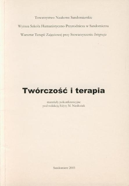SŁOWO, POEZJA I TERAPIA: Adam Kończak - Niepełnosprawni w Biblii ; Anna Różyło - Magia twórczości - na przykładzie poezji Haliny Poświatowskiej ; Andrzej Niewiadomski - Poezja jako terapia (nie)możliwa. O wierszach Eugeniusza Tkaczyszyna-Dyckiego. TWÓRCZOŚĆ JAKO FORMA TERAPII: Regina Zięba - Podstawy kreatywnej edukacji ; Jolanta Ostasz - Działania twórcze osób znacznie upośledzonych umysłowo ; Edyta M. Nieduziak - Między sztuką a nauką - od "katharsis" do psychoterapii ; Krzysztof Stachyra - Kierowana wizualizacja na gruncie muzykoterapii ; Jolanta Ostasz - Terapia dziecka z porażeniem mózgowym metodą Domana. WARSZATY: Magdalena Kossak - Narracja jako sposób poznania i rozumienia siebie oraz innych ; Janusz Antosiewicz - Zabawy i ćwiczenia przy muzyce. Spostrzeganie "kolorów muzyki" (scenariusz zajęć z muzykoterapii) ; Krzysztof Stachyra - Warsztat muzykoterapii. PREZENTACJA OŚRODKÓW: Bogusław Pitucha - Ośrodek Rehabilitacyjno-Edukacyjny "Radość Życia" w Sandomierzu ; Marek Zaleśny - Zespół Szkół Specjalnych w Stalowej Woli ; Maria Fularska, Joanna Dybowska - Warsztat Terapii Zajęciowej przy Stowarzyszeniu "Integracja" w Sandomierzu ; Grażyna Kuziora, Małgorzata Ogorzałek - Studenckie Koło Pedagogów Specjalnych Wyższej Szkoły Humanistyczno-Przyrodniczej w Sandomierzu ; Rafał Chmura - Fotografie.