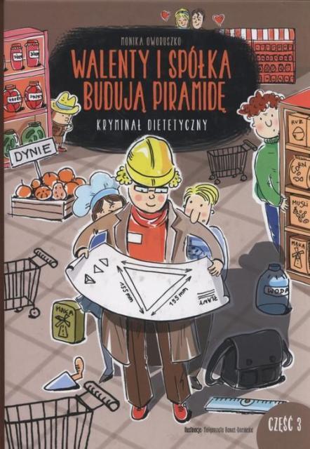 Zakochany Tęgomir postanawia schudnąć dla dziewczyny, lecz nie ma pojęcia jak się do tego zabrać. Z pomocą przyjdą mu przyjaciele i jeszcze ktoś z blond lokami. Czy teraz Olivia poczuje miłość do niego? I czy uda mu się w końcu dorwać tego rudego? "Walenty i spółka budują piramidę" to trzecia część serii kryminalno-dietetycznej. Tym razem bohaterowie zbudują piramidę zdrowego żywienia i odkryją właściwe proporcje zdrowej diety. [Wydaw. Mobuki, 2016]