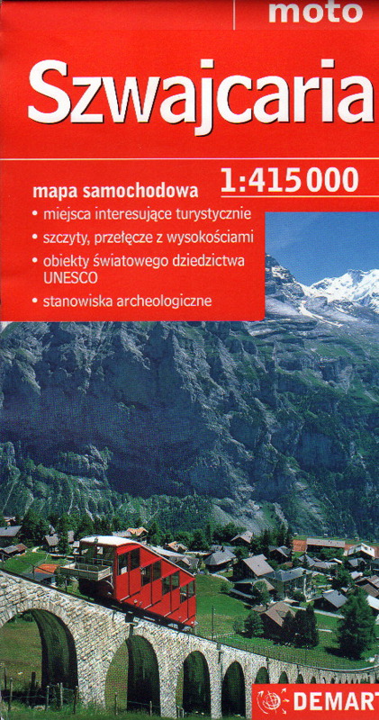 Szwajcaria : mapa samochodowa 1:415 000 / Demart SA. - Warszawa : Demart SA, cop. 2015. - 1 mapa : kolor. ; ark. pap. 68x98 cm, złoż. 23x13 cm.