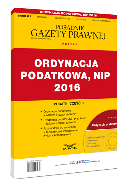 1. Ordynacja podatkowa ; 2. Ordynacja podatkowa - przepisy wykonawcze ; 3. Przewodnik po zmianach w ordynacji podatkowej ; 4. Ewidencja i identyfikacja podatników (NIP) ; 5. Przewodnik po zmianach w ustawie o zasadach ewidencji i identyfikacji podatników i płatników.