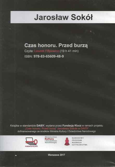 Książka w standardzie DAISY, wydana przez Fundację Klucz w ramach projektu "Czas honoru. Przed burzą" Jarosława Sokoła w DAISY dofinansowanego ze środków Ministra Kultury i Dziedzictwa Narodowego.