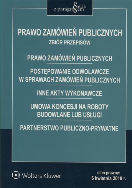 PRAWO ZAMÓWIEŃ PUBLICZNYCH: Ustawa z 29 stycznia 2004 r. - Prawo zamówień publicznych ; POSTĘPOWANIE ODWOŁAWCZE W SPRAWACH ZAMÓWIEŃ PUBLICZNYCH: Rozporządzenie Prezesa Rady Ministrów z 22 marca 2010 r. w sprawie regulaminu postępowania przy rozpoznawaniu odwołań; Rozporządzenie Prezesa Rady Ministrów z 15 marca 2010 r. w sprawie wysokości i sposobu pobierania wpisu od odwołania oraz rodzajów kosztów w postępowaniu odwoławczym i sposobu ich rozliczania ; INNE AKTY WYKONAWCZE: Rozporządzenie Ministra Rozwoju z 26 lipca 2016 r. w sprawie wykazu robót budowlanych; Rozporządzenie Ministra Rozwoju i Finansów z 22 grudnia 2017 r. w sprawie kwot wartości zamówień oraz konkursów, od których jest uzależniony obowiązek przekazywania ogłoszeń Urzędowi Publikacji Unii Europejskiej; Rozporządzenie Ministra Rozwoju z 26 lipca 2016 r. w sprawie rodzajów dokumentów, jakich może żądać zamawiający od wykonawcy w postępowaniu o udzielenie zamówienia; Rozporządzenie Ministra Infrastruktury z 2 września 2004 r. w sprawie szczegółowego zakresu i formy dokumentacji projektowej, specyfikacji technicznych wykonania i odbioru robót budowlanych oraz programu funkcjonalno-użytkowego; Rozporządzenie Ministra Infrastruktury z 18 maja 2004 r. w sprawie określenia metod i podstaw sporządzania kosztorysu inwestorskiego, obliczania planowanych kosztów prac projektowych oraz planowanych kosztów robót budowlanych określonych w programie funkcjonalno-użytkowym; Rozporządzenie Prezesa Rady Ministrów z 28 grudnia 2017 r. w sprawie średniego kursu złotego w stosunku do euro stanowiącego podstawę przeliczania wartości zamówień publicznych; Rozporządzenie Prezesa Rady Ministrów z 10 maja 2011 r. w sprawie innych niż cena obowiązkowych kryteriów oceny ofert w odniesieniu do niektórych rodzajów zamówień publicznych; Rozporządzenie Ministra Rozwoju z 26 lipca 2016 r. w sprawie protokołu postępowania o udzielenie zamówienia publicznego; Rozporządzenie Ministra Rozwoju i Finansów z 15 grudnia 2016 r. w sprawie informacji zawartych w rocznym sprawozdaniu o udzielonych zamówieniach, jego wzoru oraz sposobu przekazywania ; UMOWA KONCESJI NA ROBOTY BUDOWLANE LUB USŁUGI: Ustawa z 21 października 2016 r. o umowie koncesji na roboty budowlane lub usługi ; PARTNERSTWO PUBLICZNO-PRYWATNE: Ustawa z 19 grudnia 2008 r. o partnerstwie publiczno-prywatnym.
