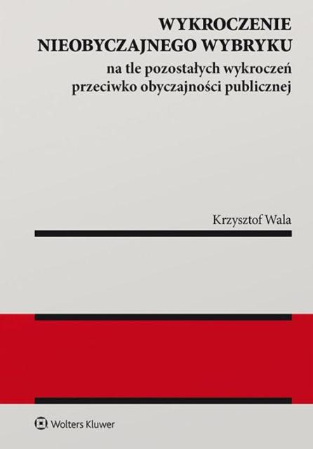 Wstęp : R. I. Ochrona obyczajowości publicznej przed zachowaniami kwalifikowanymi obecnie jako nieobyczajny wybryk w ujęciu historycznym: 1.1. Wstę ; 1.2. Ustawodawstwo obowiązujące w czasie zaborów: Ziemie zabory rosyjskiego ; Ziemie zaboru pruskiego ; Ziemie zaboru austriackiego ; 1.3. Okres po odzyskaniu niepodległości ; 1.4. Okres obowiązywania Prawa i wykroczeniach z 1932 r. ; 1.5. Prace kodyfikacyjne poprzedzające uchwalenie Kodeksu wykroczeń z 1971 r. ; 1.6. Podsumowanie ; R. II. Zagadnienia prawnoporównawcze ; R. III. Wykroczenia nieobyczajnego wybryku w ujęciu teoretycznym oraz empirycznym: 3.1. Wstęp ; 3.2. Część teoretyczna: Przedmiot ochrony wykroczenia z art. 140 k.w. ; Strona przedmiotowa wykroczenia z art. 140 k.w. ; Strona podmiotowa wykroczenia z art. 140 k.w. ; Podmiot wykroczenia z art. 140 k.w. ; Ustawowe zagrożenia karą ; Zbieg przepisów w kontekście art. 140 k.w. ; Analiza rodzajów zachowań mogących stanowić naruszenie art. 140 k.w. ; 3.3 Część empiryczna: Dobór próby ; Wstęp ; Dane dotyczące zdarzenia kwalifikowanego z art. 140 k.w. ; Dane dotyczące czynności wyjaśniających ; Dane dotyczące postępowania sądowego ; Dane dotyczące sprawcy wykroczenia z art. 140 k.w. ; Charakterystyka wybranych stanów faktycznych ; R. IV. Umieszczenie nieprzyzwoitych form ekspresji oraz używanie słów nieprzyzwoitych w miejscu publicznym: 4.1. Wstęp ; 4.2. Przedmiot ochrony ; 4.3. Strona przedmiotowa: Znamiona określające penalizowane formy ekspresji ; Miejsce publiczne ; Materialny czy formalny charakter wykroczenia? ; 4.4. Podmiot i strona podmiotowa wykroczenia ; 4.5. Ustawowe zagrożenia karą ; 4.6. Zagadnienie zbiegu przepisów: Zbieg z przepisami z Kodeksu wykroczeń ; Zbieg z wykroczeniami z usta szczególnych ; Zbieg z przestępstwami ; 4.7. Podsumowanie ; R. V. Oferowanie dokonania czynu nierządnego (tzw. racolage): 5.1. Wstęp ; 5.2. Prawnomiędzynarodowe aspekt zagadnienia ; 5.3. Przedmiot ochrony ; 5.4. Strona przedmiotowa: Formy złożenia propozycji ; Pojęcie czynu nierządnego na gruncie Kodeksu karnego z 1935 r. ; Pojęcie czynu nierządnego na gruncie Kodeksu karnego z 1969 r. ; Terminy "obcowania płciowego" i "inna czynność seksualna" a "czyn nierządny" ; Pozostałe kwestie związane ze stroną przedmiotową ; 5.5. Strona podmiotowa: Pojęcie korzyści materialnej ; 5.6. Podmiot wykroczenia ; 5.7. Wymiar kary ; 5. 8. Kwestia zbiegu przepisów: Zabieg z innymi przepisami statuującymi wykroczenia ; Zbieg art. 142 k.w. z przepisami statuującymi przestępstwa ; 5.9. Podsumowanie.