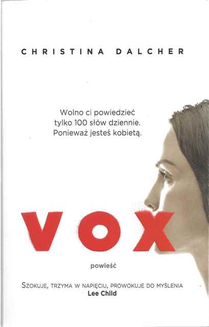 Co zrobiłyby kobiety, gdyby nagle liczba słów, które wypowiadają każdego dnia, uległa drastycznemu ograniczeniu? Feministyczna dystopia o świecie rządzonym przez mężczyzn, w którym kobiety mogą wypowiedzieć tylko 100 słów dziennie. Mocna, wzbudzająca emocje książka, ważny głos w epoce ruchu #MeToo i w świetle ogólnoświatowych dyskusji o prawach kobiet. Czarna bransoletka zaciśnięta na nadgarstku. Cyfrowe znaczki układają się w liczbę 15. Liczba wypowiedzianych słów nie może przekroczyć 100, każde kolejne słowo oznacza coraz silniejszy ładunek elektryczny. Licznik zresetuje się o północy. Zasady są proste: najlepiej usunąć wszystkie językowe ozdobniki, ograniczyć pytania do tych, na które wystarczy odpowiedzieć „tak” lub „nie”. Nie pytać dzieci, jak poszło w szkole. Nie rozmawiać z mężem, nie wdawać się w dyskusje. Ważyć każde słowo. Neurolingwistka dr Jean McClellan wciąż nie potrafi powiedzieć, jak się znalazła w tej utopistycznej rzeczywistości, gdzie rola wszystkich kobiet została ograniczona do milczącej obecności, do zapewniania rodzinie ciepłego posiłku na stole i czystego lokum. Jak do tego doszło? Kiedy, dosłownie i w przenośni, kobiety zostały zakute w kajdany? Recenzenci podkreślają, że Vox to „kawał dobrej literatury. Porusza, skłania do refleksji, inspiruje, rozpala emocje. Jest fenomenalna i niebagatelna. To jedna z tych książek, o których chce się opowiedzieć wszystkim dookoła”. Szokuje, trzyma w napięciu, prowokuje do myślenia. [lubimyczytac.pl, 2019]