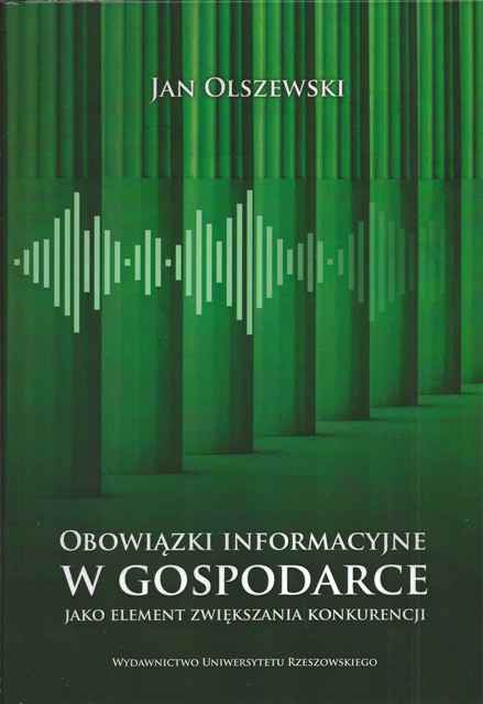 Wstęp ; Cz. I. USTALENIE PODSTAWOWYCH POJĘĆ ZWIĄZANYCH Z PROCESAMI INFORMACYJNYMI I ZJAWISKIEM KONKURENCJI: R. I. Uwagi wstępne do części I ; R. II. Ustalenie pojęcia informacji pojęć zbliżonych ; R. III. Pojęcia związane z dokumentami i bazami danych ; R. IV. Ustalenie pojęciowe konkurencji i jej determinantów ; R. V. Ustalenie pojęcia towaru i rynku właściwego ; R. VI. Ustalenie pojęcia społecznej gospodarki rynkowej i jej determinantów ; R. VII. Podsumowanie części I. ; CZ. II. GENERALNE DYREKTYWY INFORMACJI W PRAWIE GOSPODARCZYM. PRZEGLĄD ZASAD, FUNKCJI I CELÓW TOWARZYSZĄCYCH DYREKTYWY INFORMOWANIA W PRAWIE GOSPODARCZYM: R. I. Uwagi wstępne do części II ; R. II. Zasady w procesie informowania ; R. III. Funkcje informowania ; R. IV. Cele informowania ; R. V. Podsumowanie części II ; CZ. III. NORMATYWNE WSKAZANIA W ZAKRESIE TWORZENIA I UDOSTĘPNIANIA INFORMACJI: R. I. Uwagi wstępne do części III ; R. II. Normy zasad tworzenia prawa jako determinanty procesu informacyjnego ; R. III. Europejski Kodeks Dobrej Praktyki Administracyjnej jako prawne źródło określające katalog zasad wzmacniających jakość działań informacyjnych ; R. IV. Obowiązki w zakresie dostępności cyfrowej podmiotów publicznych ; R. V. Zasady tworzenia informacji naukowych i pozyskiwania źródeł o zdarzeniach w oparciu o dobre praktyki w badaniach naukowych i kodeksy etyczne ; R. VI. Posumowanie części III. ; CZ. IV. EWOLUCJA I ŹRÓDŁA WAŻNIEJSZYCH OBOWIĄZKÓW INFORMACYJNYCH W SFERZE GOSPODARCZEJ: R. I. Uwagi wstępne do części IV. ; R. II. Historyczne i aktualne uwarunkowania istnienia w Polsce powszechnej luki informacyjnej ; R. III. Trzy etapy rozwoju prawa do informacji w prawie gospodarczym ; R. IV. Ewelucja prawa w zakresie dostępu do informacji publicznej ; R. V. Regulacje pozagospodarcze wspierające procesy informacyjne ; R. VI. Podsumowanie części IV. ; CZ. V. PODMIOTY WYKONUJĄCE OBOWIĄZKI INFORMACYJNE: R. I. Uwagi wstępne do części V. ; R. II. Grupy podmiotów w SGR i ich rola w obowiązkach informacyjnych ; R. III. Wyspecjalizowane podmioty informujące działające w formie rejestrów - ogólna charakterystyka ; R. V. KRS jako wyspecjalizowany podmiot informujący - ogólna charakterystyka ; R. V. Zorganizowane instytucje informujące pozarejestrowe i ich ogólna charakterystyka ; R. VI. Podsumowanie do części V. ; CZ. VI. OBOWIĄZKI INFORMACYJNE PRZEDSIĘBIORCÓW: R. I. Uwagi wstępne do części VI ; R. II. Podstawowe obowiązki informacyjne związane z oznaczeniami przedsiębiorcy i zgłaszaniem podejmowania działalności gospodarczej ; R. III. Zgłoszenie informacji przez przedsiębiorców do KRS ; R. IV. Wykaz rejestrów i ich podstawowe dane ; R. V. Rejestr dłużników niewypłacalnych (przepisy zostaną uchylone 1 grudnia 2020 r. a rejestr ten zastąpiony zostanie przez Krajowy Rejestr Zadłużonych) ; R. VI. Krajowy Rejestr Zadłużonych ; R. VII. Obowiązki informacyjne przedsiębiorców dla konsumentów ; R. VIII. Podsumowanie części VI ; CZ. VII. WYKAZ WAŻNIEJSZYCH WNIOSKÓW.