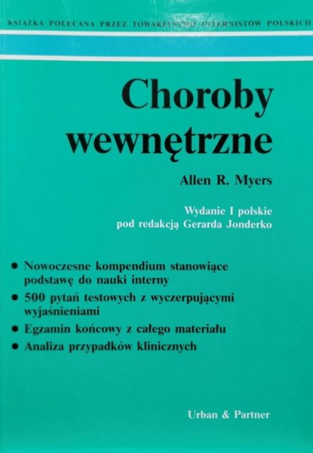 Choroby wewnętrzne / Allen R. Myers ; [z angielskiego tłumaczyła Bożena Sobkowicz-Woźniak i inni]. - Wydanie 1. polskie / pod redakcją Gerarda Jonderko - Wrocław : Urban & Partner, 1995. - 878 stron ; 24 cm.
