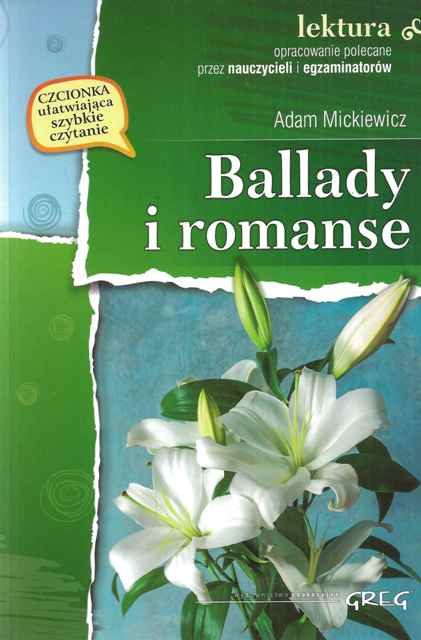 "Ballady i romanse" Adama Mickiewicza to zbiór utworów bardzo ważnych dla polskiej literatury - otwierają one epokę polskiego Romantyzmu. Każda z ballad niesie ze sobą językową świeżość i oryginalność, a także charakterystyczne dla epoki treści i przesłania. Mamy tu więc nieszczęśliwą miłość, morderstwo, duchy, nadnaturalne interwencje i błąkające się upiory, groźną naturę wymierzającą kary złym ludziom i surowe, ale zawsze sprawiedliwe boskie wyroki. Książka zawiera pełen tekst lektury. Na końcu książki zamieszczono opracowanie, w którym znajduje się bardzo szczegółowe streszczenie oraz drugie skrócone, ułatwiające szybkie przygotowanie się przed lekcją. Opracowanie zawiera ponadto plan wydarzeń, wnikliwie wyjaśnioną problematykę oraz szerokie charakterystyki bohaterów. [https://www.greg.pl/lektury/8,257_Ballady-i-romanse.html, dostęp 9.11.2021]