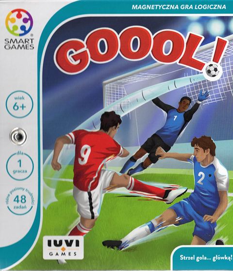 Strzel gola... główką! Ułóż z płytek ścieżkę, tak, aby gracze z twojej drużyny podawali między sobą piłkę i strzelili zwycięską bramkę! Czy zdobędziesz wszystkie 48 bramek? Gooool! To piłkarska gra logiczna z 48 zadaniami o rosnącym poziomie trudności. [Wydawnictwo IUVI, 2021]