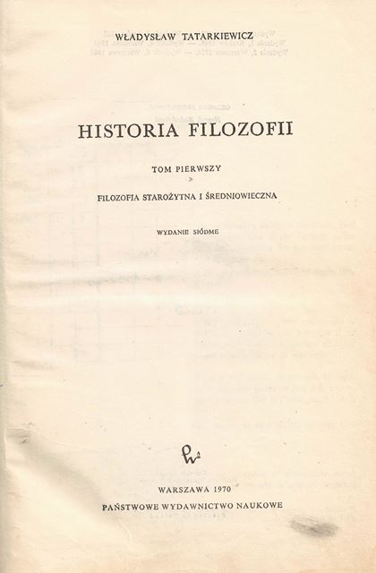 Historia filozofii. T. 1, Filozofia starożytna i średniowieczna / Władysław Tatarkiewicz. - Wydanie siódme. - Warszawa : Państwowe Wydawnictwo Naukowe, 1970. - X, [2], 320, [3] strony, [22] strony tablic : ilustracje ; 23 cm.