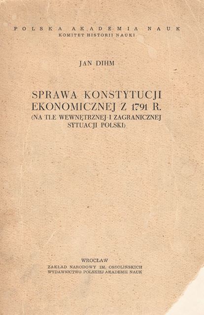 Przedstawiona tu praca o sprawie Konstytucji ekonomicznej z 1791 r. jest pierwszą częścią zamierzonego dzieła. Przy jej pisaniu myślał oczywiście autor o calości obejmujacej też i rok 1792 i dlatego włśnie szerzej uwzględnił w niej te zagadnienia, które w dalszym ciągu pracy będą również ważne dla zrozumienia ogólnej sytuacji politycznej, jak też dla wyjaśnienia losów sprawy chłopskiej, sprawy starostw i całego projektu Ossowskiego. Całe dzieło zostało podzielone na czery części. Pierwsza obejmuje okres od 1789 do uchwalenia Ustawy rządowej, druga - od 3 maja do połowy czerwca 1791, trzecia obejmuje okres przed limitą sejmową z omówieniem mowy Kołłątaja z 28 czerwca tego roku i zasad Konstytucji ekonomicznej, czwarta - okres limity sejmowej do połowy września 1791. Niniejszy tom obejmuje trzy części pracy, czwarta ukaże się jako odddzielny tom. [ze Wstępu]