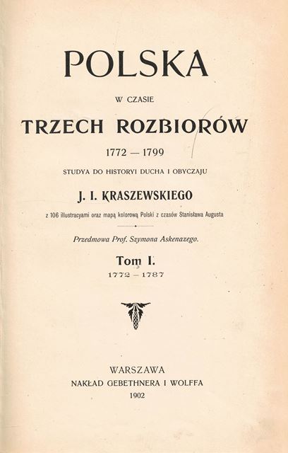 Polska w czasie trzech rozbiorów 1772-1799 : studya do historyi ducha i obyczaju. T. 1, 1772-1787 / J. I. Kraszewskiego ; przedmowa Prof. Szymona Askenazego. - Warszawa : nakład Gebethnera i Wolffa, 1902 (Warszawa : druk Piotra Laskauera i S-ki). - [4], XVI, 424, [1] strona, [1] karta tablic : ilustracje, mapa, portrety ; 24 cm.