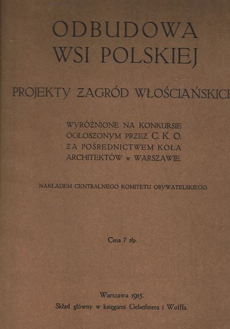 Reprint z: Odbudowa wsi polskiej : projekty zagród włościańskich wyróżnione na konkursie ogłoszonym przez C.K.O. za pośrednictwem Koła Architektów w Warszawie. Warszawa : nakładem Centralnego Komitetu Obywatelskiego, 1915.