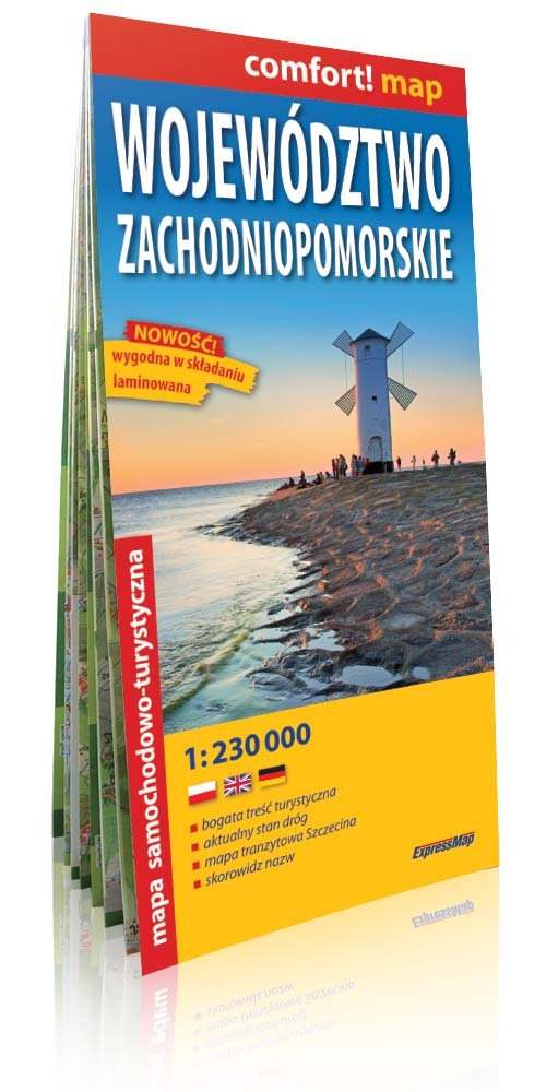 Niezapomniane widoki z latarni morskiej w Kołobrzegu, spacer Wałami Chrobrego w Szczecinie, słodkie lenistwo na plaży w Rewalu, a może zabawa na Festiwalu Gwiazd w Międzyzdrojach? W Zachodniopomorskiem na turystów czeka wiele atrakcji. Wygodna w składaniu, dwustronnie laminowana mapa tego województwa pomoże je odnaleźć. - skorowidz miejscowości. - mapa tranzytowa Szczecina w skali 1:80 000,- plastyczna rzeźba terenu,- granice parków narodowych i krajobrazowych, miejscowości atrakcyjne turystycznie,- bogata treść turystyczna,- stacje paliw z podziałem na sieci,- odległości drogowe,- krajowa i międzynarodowa numeracja dróg,- autostrady i drogi ekspresowe z nazwami węzłów,- aktualny stan sieci drogowej, a także drogi w budowie i planowane do 2018 r.