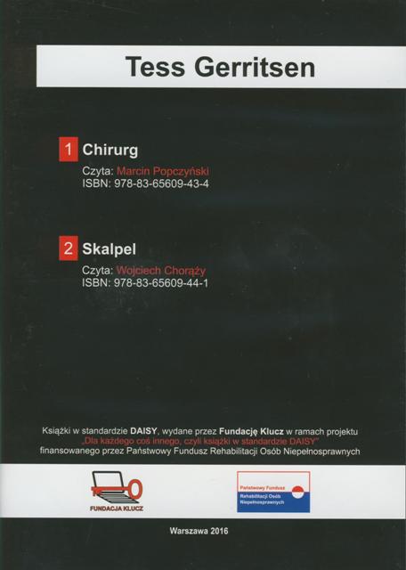Chirurg [Dokument dźwiękowy] ; Skalpel / Tess Gerritsen. - Warszawa : Fundacja Klucz, 2016. - 1 płyta CD (22 godz. 37 min) : digital, stereo ; 12 cm.