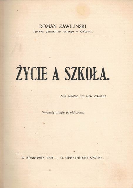 Życie a szkoła / Roman Zawiliński. - Wydanie drugie powiększone. - Kraków : G. Gebethner i Spółka, 1919 (Kraków : Drukarnia Literacka pod zarz. L. K. Górskiego). - VIII, 150 stron ; 23 cm.