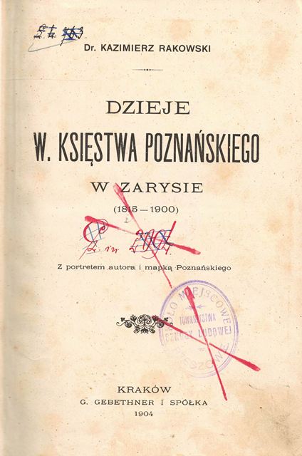 Dzieje W. Księstwa Poznańskiego w zarysie (1815-1900) / Kazimierz Rakowski. - Kraków : G. Gebethner i Spółka, 1904 (Kraków : druk W. L. Anczyca i Spółki). - [4], 286, [1] strona, [2] karty tablic : ilustracje, mapa ; 21 cm.