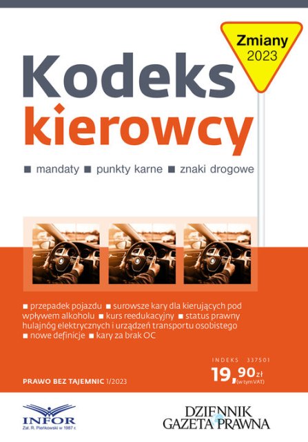 Kodeks kierowcy : mandaty, punkty karne, znaki drogowe / [autor: Anna Maliszewska]. - Wydanie I/2023. - Warszawa : Infor, luty 2023. - 207 stron : fotografie, ilustracje ; 21 cm.
