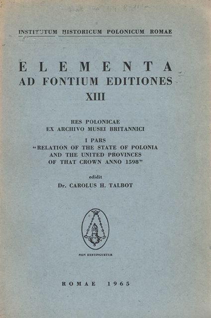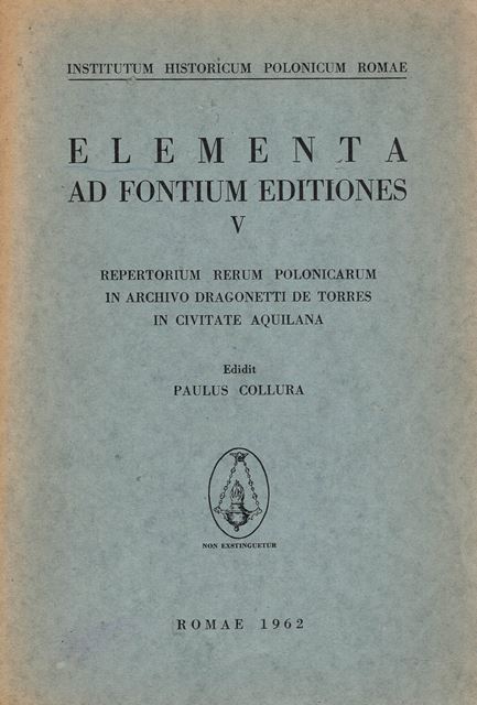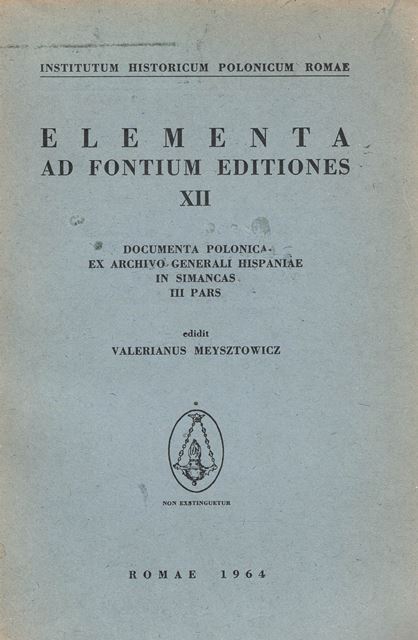 I. Sigismundi I regis Poloniae documentum in Australia inventum / ed. V. Meysztowicz. De litteris quas card. Fabritius Spada Secretarius Status ad Andream Santacroce nuntium ap. in Poloniam scribebat / ed. V. Meysztowicz. De documentis Polonicis Archivo Secreto Vaticano / ed. W. Wyhowska de Andreis. Pie IX et l'Eglise Catholique en Pologne. La suppression des diocèses catholiques par le gouvernement russe après l'insurrection de 1863-1864. 1866-1869 / ed. S. Olszamowska Skowrońska. II. Mare Russiae / Henryk Paszkiewicz. Chorążowie w parlamentaryzmie litewskim przed unią lubelską / Witold Kamieniecki. Archiwum w Kopenhadze, jako podstawa do polskich badań nad dziejami Bałtyku w XVI i XVII w. / Leon Koczy.