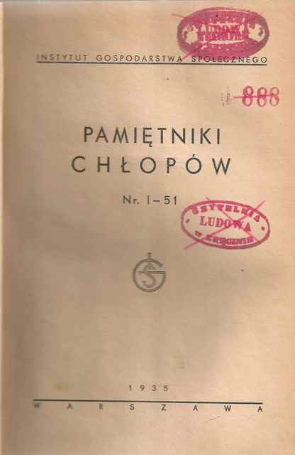 Pamiętniki chłopów : nr 1-51 / [przedmowa] Ludwik Krzywicki ; Instytut Gospodarstwa Społecznego. - Warszawa : Instytut Gospodarstwa Społecznego, 1935 (Warszawa : Drukarnia Gospodarcza). - XLVI, 714, [6] stron, [1] karta tablic : ilustracje ; 26 cm.