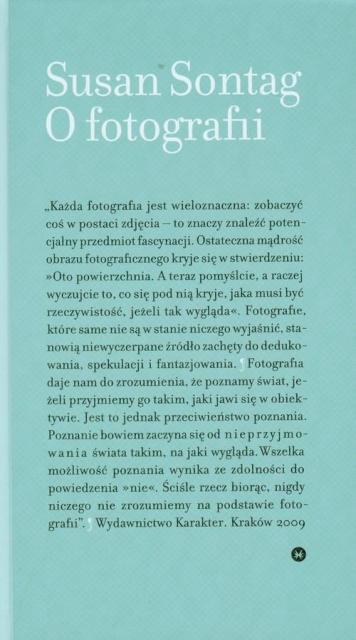 Najważniejsza w historii książka poświęcona fotografii. Wybitna amerykańska intelektualistka bada znaczenie i funkcję fotografii we współczesnym świecie. Czym w swej istocie jest fotografia? Jakie są jej związki z malarstwem i sztuką? Jak zjawisko fotografii zmieniło nasz sposób postrzegania świata? W jakim stopniu fotografia interpretuje rzeczywistość? Jaka jest relacja między fotografem i obiektem oraz między zdjęciem a patrzącym? Na czym polega współczesny heroizm widzenia? Z jakich powodów sięgamy po aparat fotograficzny? Dlaczego skłonni jesteśmy przechowywać zdjęcia bliskich nam osób? Autorka analizuje prace wybitnych fotografów, przytacza teksty pisarzy i filozofów, ale pisze również o fotografowaniu jako części codziennego życia, swoistym społecznym rytuale, starając się zrozumieć jego funkcję i sens. Głośna książka Susan Sontag to nie tylko zbiór błyskotliwych esejów o fotografii, lecz też pasjonująca, wnikliwa analiza współczesnego świata. Bo przecież, jak sama pisze, "zbierać fotografie to zbierać świat". [Karakter, 2009]