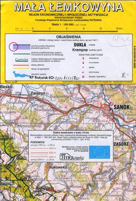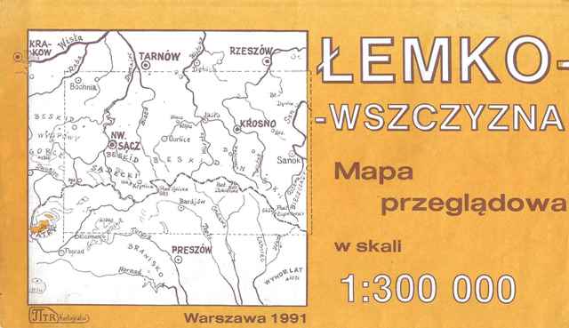 Łemkowszczyzna : mapa przeglądowa : w skali 1:300 000 / red. Piotr Kamiński. - Wyd. 2. poprawione. - Warszawa : ΠTR Kartografia, 1991. - 1 mapa : wielobarwna ; 34x49 cm, złożona 17x10 cm.
