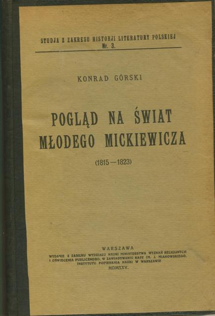 Pogląd na świat młodego Mickiewicza (1815-1823) / Konrad Górski. - Warszawa : Kasa im. J. Mianowskiego - Instytut Popierania Polskiej Twórczości Naukowej, 1925 (Warszawa : Druk Zakładów Drukarskich W. Piekarniaka). - 151, [7] stron ; 24 cm.