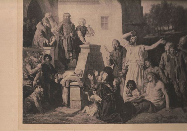 Przedstawia Króla Kazimierza Wielkiego i Żydów. Żydzi tułający się proszą króla o przytułek w Polsce.