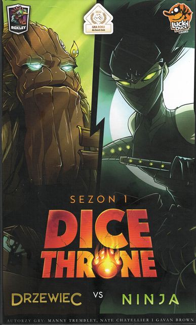 Dice throne : Drzewiec vs Ninja. Sezon 1 / autorzy gry: Manny Trembley, Nate Chatellier i Gavan Brown ; [ilustracje Manny Trembley, Nick Malara, Damien Mammoliti]. - Kraków : Lucky Duck Games, 2021. - 1 pudełko [Ninja: 5 kości, licznik zdrowia, licznik punktów walki, składana plansza bohatera, karta informacyjna, 32 karty bohatera, karta przebiegu tury, 5 Ninjutsu ; Drzewiec: 5 kości, licznik zdrowia, licznik punktów walki, składana plansza bohatera, karta informacyjna, 32 karty bohatera, karta przebiegu tury, 3 Nasiona, 2 Sadzonki, Driada, 2 kolczaste winorośle, 2 źródła, zasady gry] ; 26x16x7 cm.