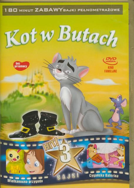 "Kota w butach" nie trzeba nikomu przedstawiać. Kapelusz z duzym rondem, wysokie buty z miękkiej skóry... Bajka z kanonu klasyki literatury dziecięcej mistrza Perrault. Kot potrafi mówić ludzkim głosem i ma plan uszczęśliwienia swego przyjaciela! Dodatkowo na płycie dwie pełnometrazowe bajki. Pierwsza, "Wielkanocna przygoda" to przygody sympatycznego zająca. Poświęcenie i troska to jej przesłanie. "Cygańska Balerina" natomiast to baśń o pieknej i utalentowanej Szari. Przenosi Nas w świat baletu, gdzie dziewczynce pomagają w osiągnięciu celu czarodziejskie pantofelki. Serdecznie polecam! [Media Service]