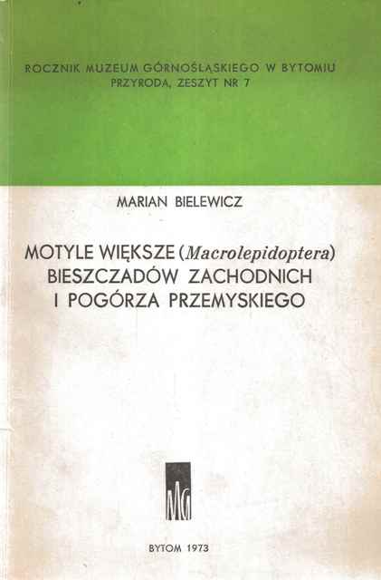 Motyle większe (Macrolepidoptera) Bieszczadów Zachodnich i Pogórza Przemyskiego / Marian Bielewicz. - Bytom : Muzeum Górnośląskie, 1973. - 169, [1] strona, [1] karta tablic złożona ; ilustracje, mapy ; 24 cm.