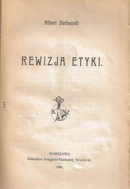 Rewizja etyki / Albert Barbanell. - Warszawa : Nakładem Księgarni Naukowej, 1906 (Warszawa : K. Kowalewski). - VI, [1], 159, [2] strony ; 23 cm.