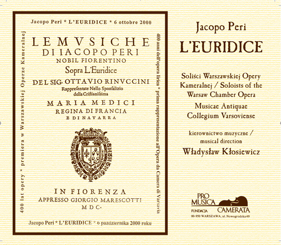 L'Euridice [Dokument dźwiękowy] / Jacopo Peri ; libretto Ottavio Rinuccini. - Warszawa : Pro Musica Camerata, 2000. - 2 płyty CD (54 min 16 s, 47 min 3 s) : digital, stereo. ; 12 cm + Dod. druk. : 92 s.