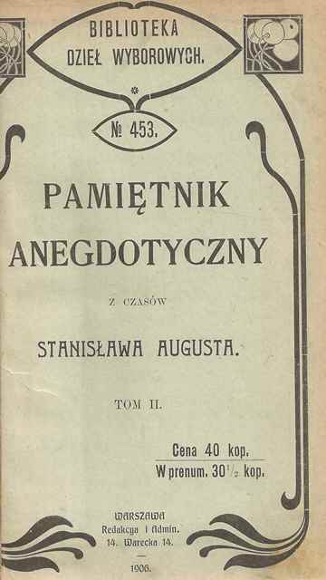 Pamiętnik anegdotyczny z czasów Stanisława Augusta. T. 1. - Warszawa : Redakcja i Administracja [Biblioteki Dzieł Wyborowych], 1906 (Warszawa : Druk Ed. Nicz i S-ki). - 119, [2] strony ; 17 cm.