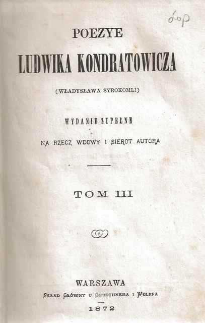 Poezye Ludwika Kondratowicza (Władysława Syrokomli). T. 3. - Wydanie zupełne na rzecz wdowy i sierot autora. - Warszawa : Skład Główny u Gebethnera i Wolffa, 1872 ([Warszawa] : J. Unger). - [4], 359, [1] strona ; 18 cm.