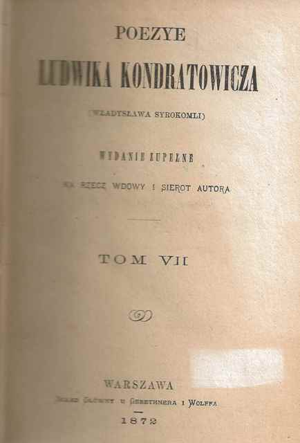 Poezye Ludwika Kondratowicza (Władysława Syrokomli). T. 7. - Wydanie zupełne na rzecz wdowy i sierot autora. - Warszawa : Skład Główny u Gebethnera i Wolffa, 1872 ([Warszawa] : J. Unger). - [4], 330 stron ; 18 cm.