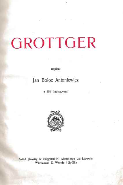 Grottger / napisał Jan Bołoz Antoniewicz. - [Lwów] : skład główny w księgarni H. Altenberga we Lwowie, [1910] (Kraków : Druk. W. L. Anczyc). - [4], 592 strony, [29] kart tablic : ilustracje ; 25 cm.