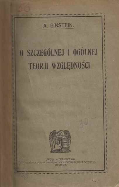 O szczególnej i ogólnej teorji względności : (wykład przystępny) / A. Einstein ; z upoważnieniem autora przełożył z 11-go wydania oryginału M. T. Huber. - Wydanie 2 przejrzane i uzupełnione dialogiem o zarzutach przeciwko teorji - Lwów ; Warszawa : Książnica Polska Towarzystwa Nauczycieli Szkół Wyższych, 1922 (Lwów : S. Bednarski). - 104 strony : ilustracje, rysunki ; 22 cm.