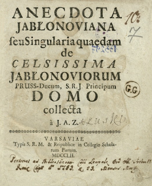 Tyt. z dod. s. tyt.: Anecdota Jablonoviana seu singulari quaedam de Celsissima Jablonoviorum Domo colecta.